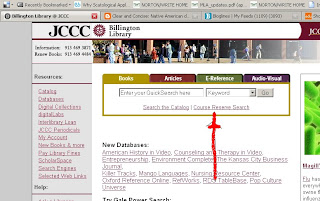 I now share research with students via JCCC library’s electronic course reserve. Just go to the Billington Library homepage, then click the “course reserve search” link indicated by the red arrow in the top image to the right (click either image to enlarge).